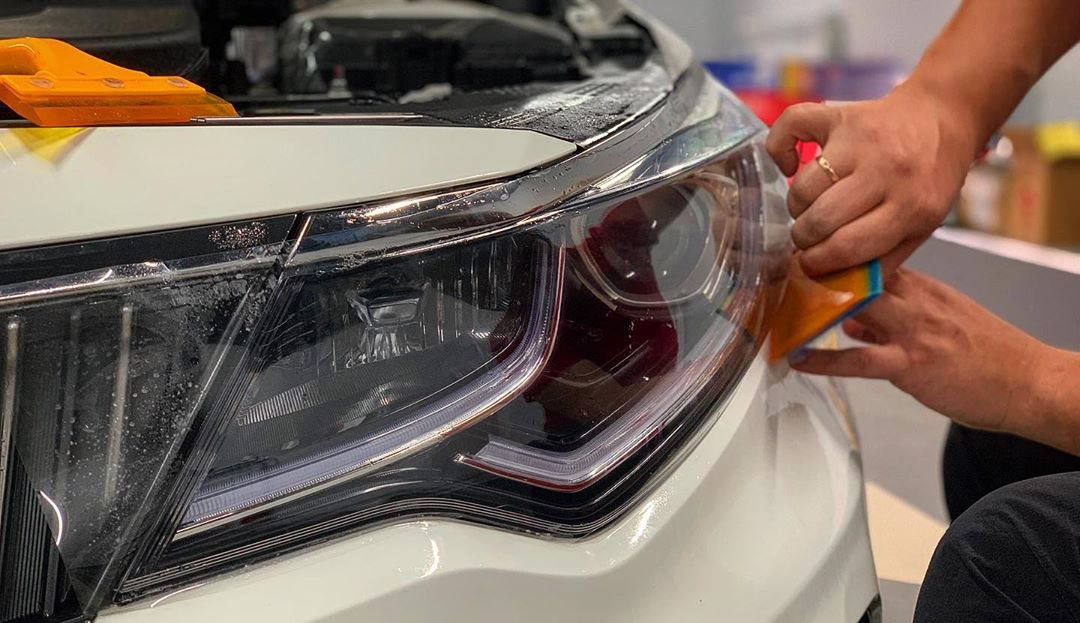 ВНИМАНИЕ! Перед началом работ необходимо убедиться, что у фар нет керамического покрытия. Если оно нанесено, оклеить фару пленкой не получится из-за отсутствия адгезии.